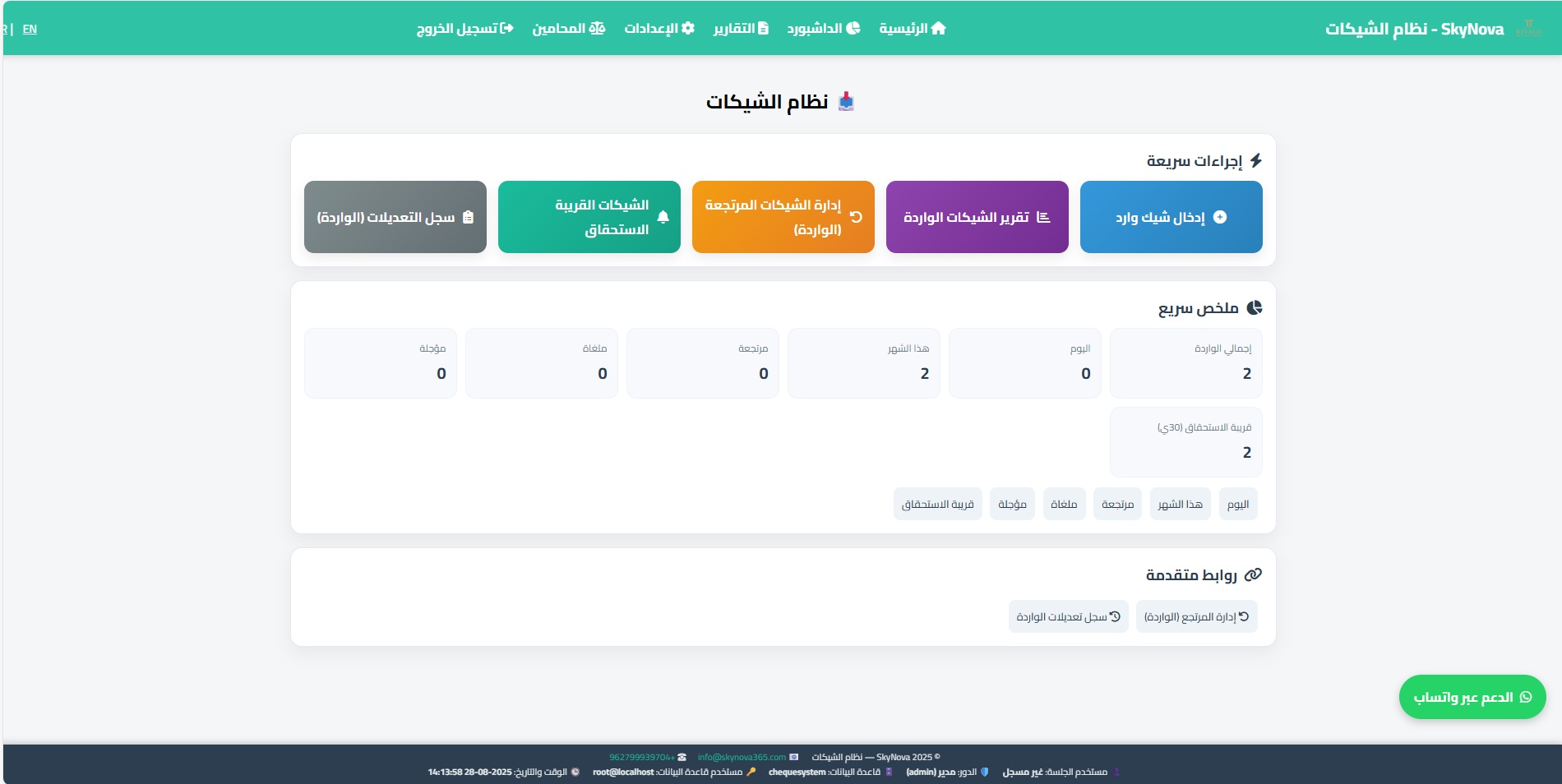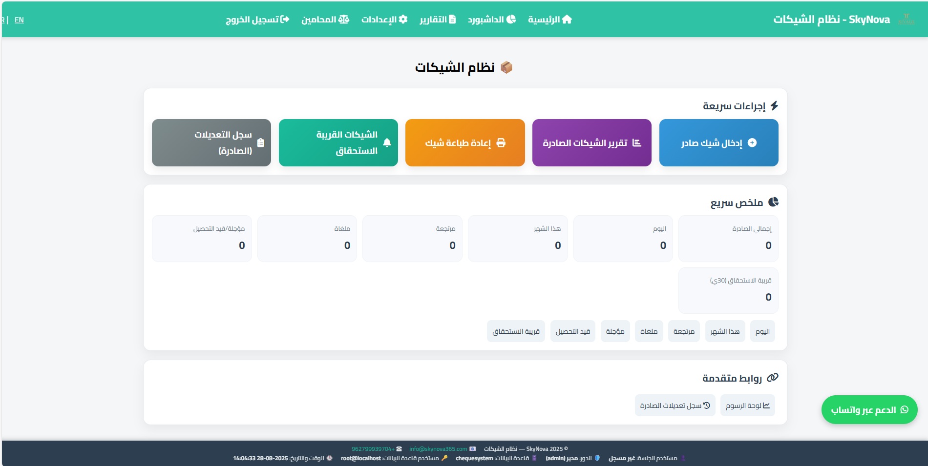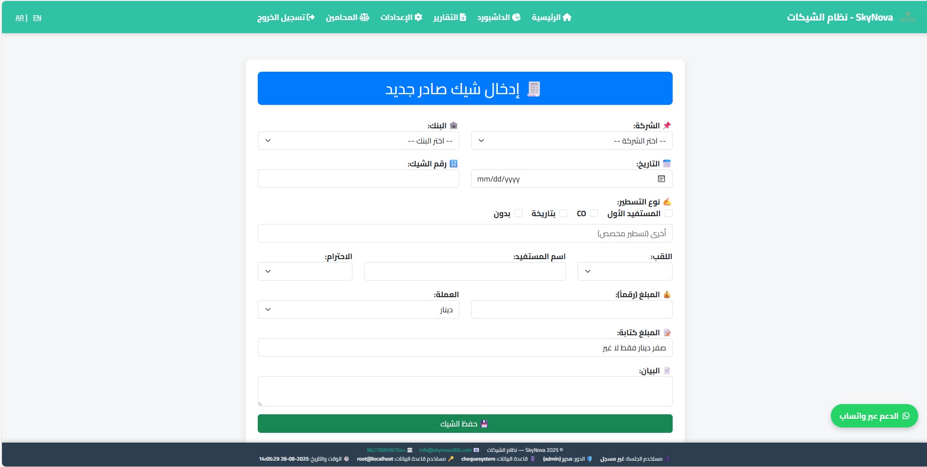 من إدخال الشيكات إلى طباعتها على نماذج البنوك الأردنية، مع التفقيط بالعربية والإنجليزية، فلاتر وتقارير قوية، سجل تدقيق للتغييرات، وصلاحيات مرنة للأدوار.