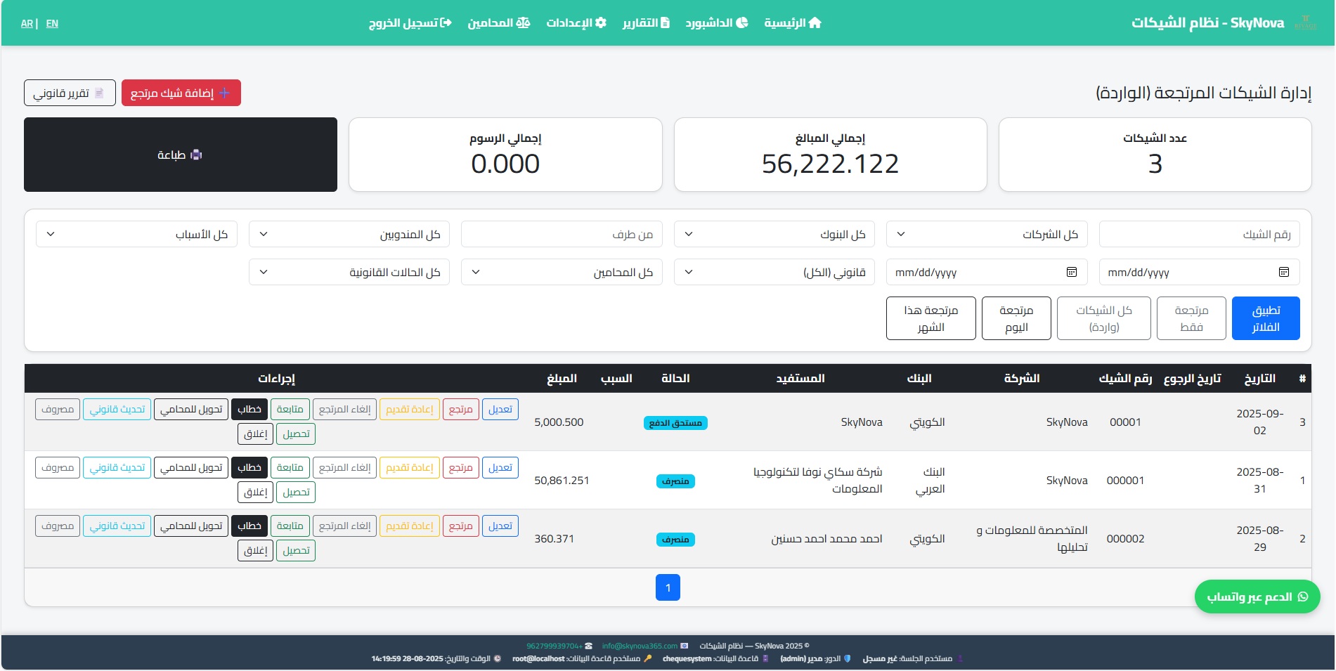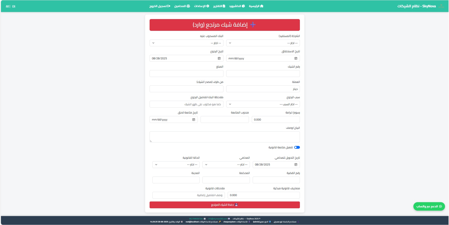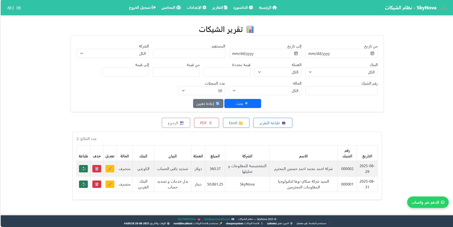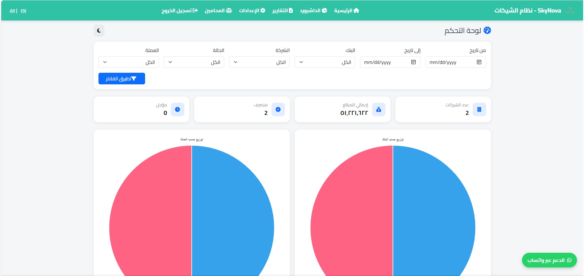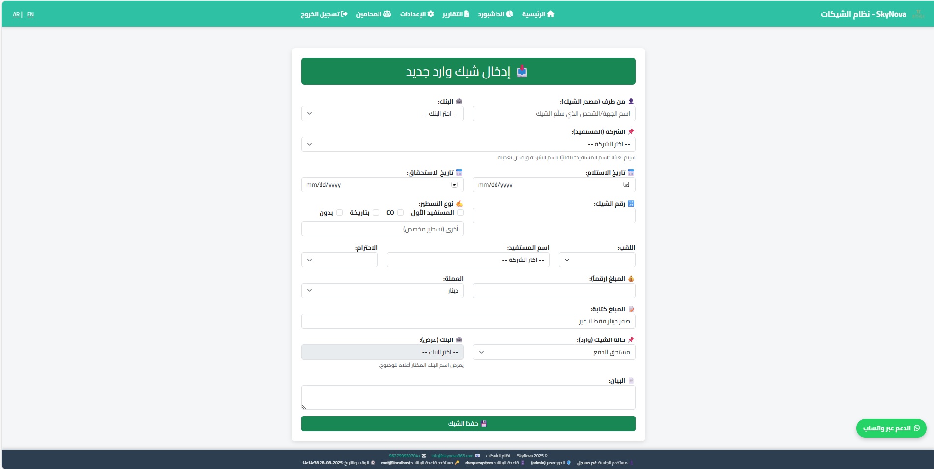 إدخال، تعديل، حذف، وطباعة للشيكات الصادرة والواردة مع تتبّع الحالة (وارد، صادر، مدفوع، مرتجع، ملغى...)