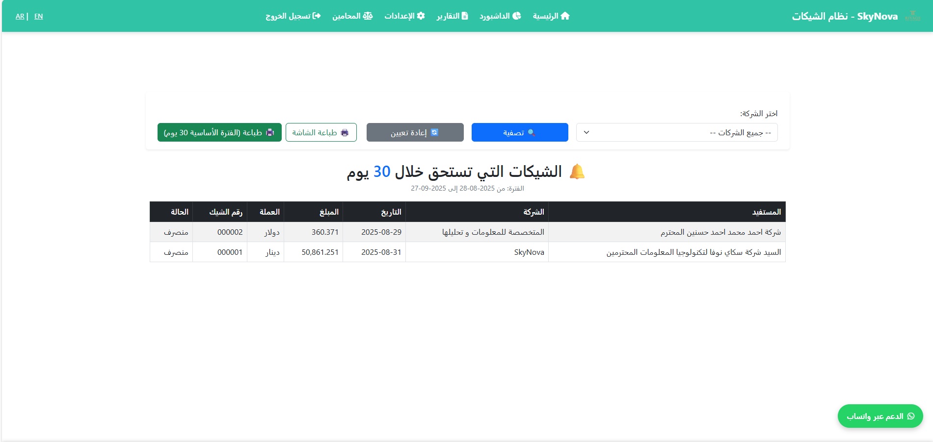 تنبيهات للشكات القريبة الاستحقاق على عدة شاشات وبفترات مرنة من الإعدادات.